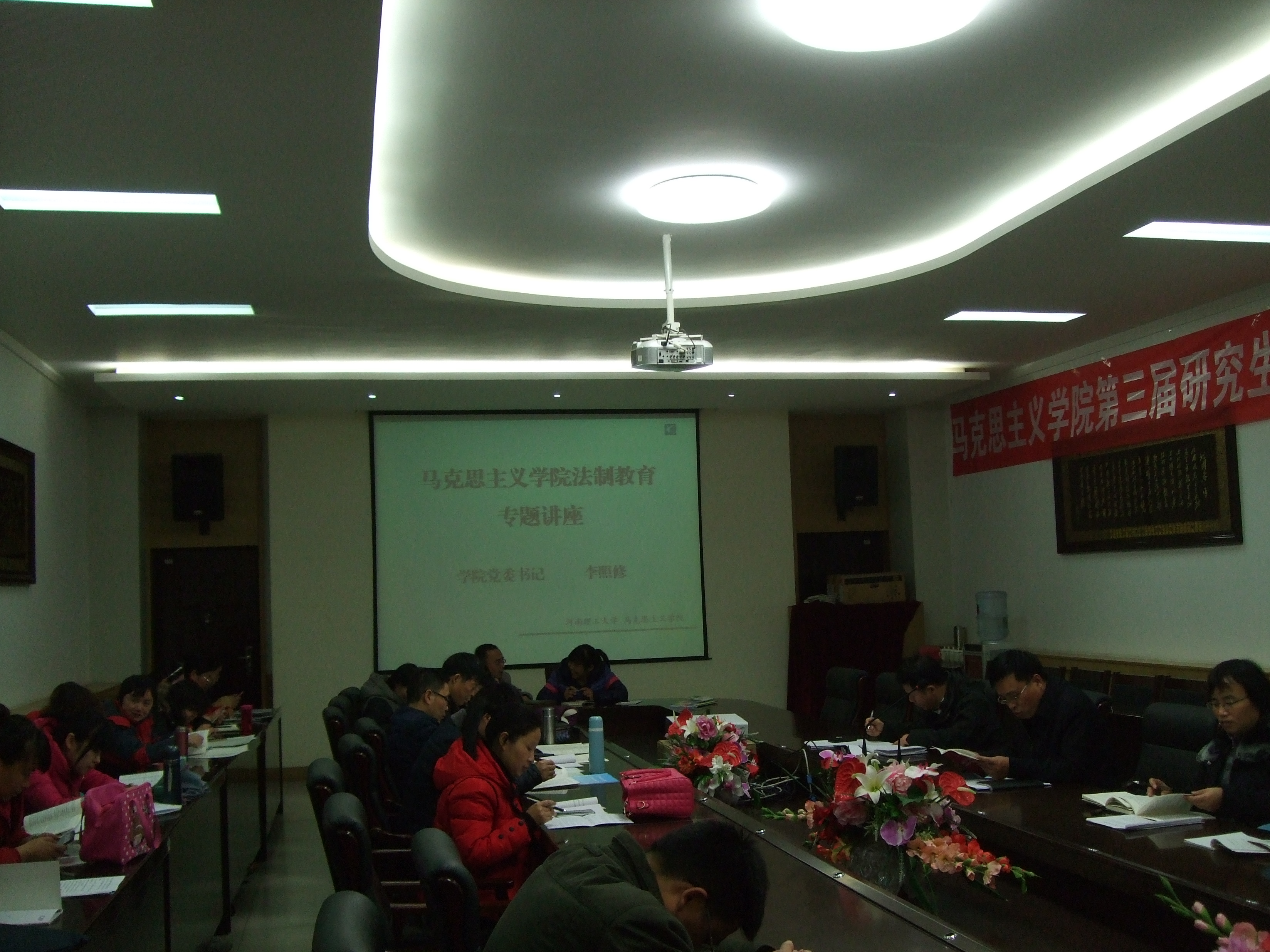 11月24日,马克思主义学院在文综楼202教室,学院党委书记做法制教育专题讲座,马克思主义学院全体教职工参加讲座。讲座由学院院长侯菊英主持。