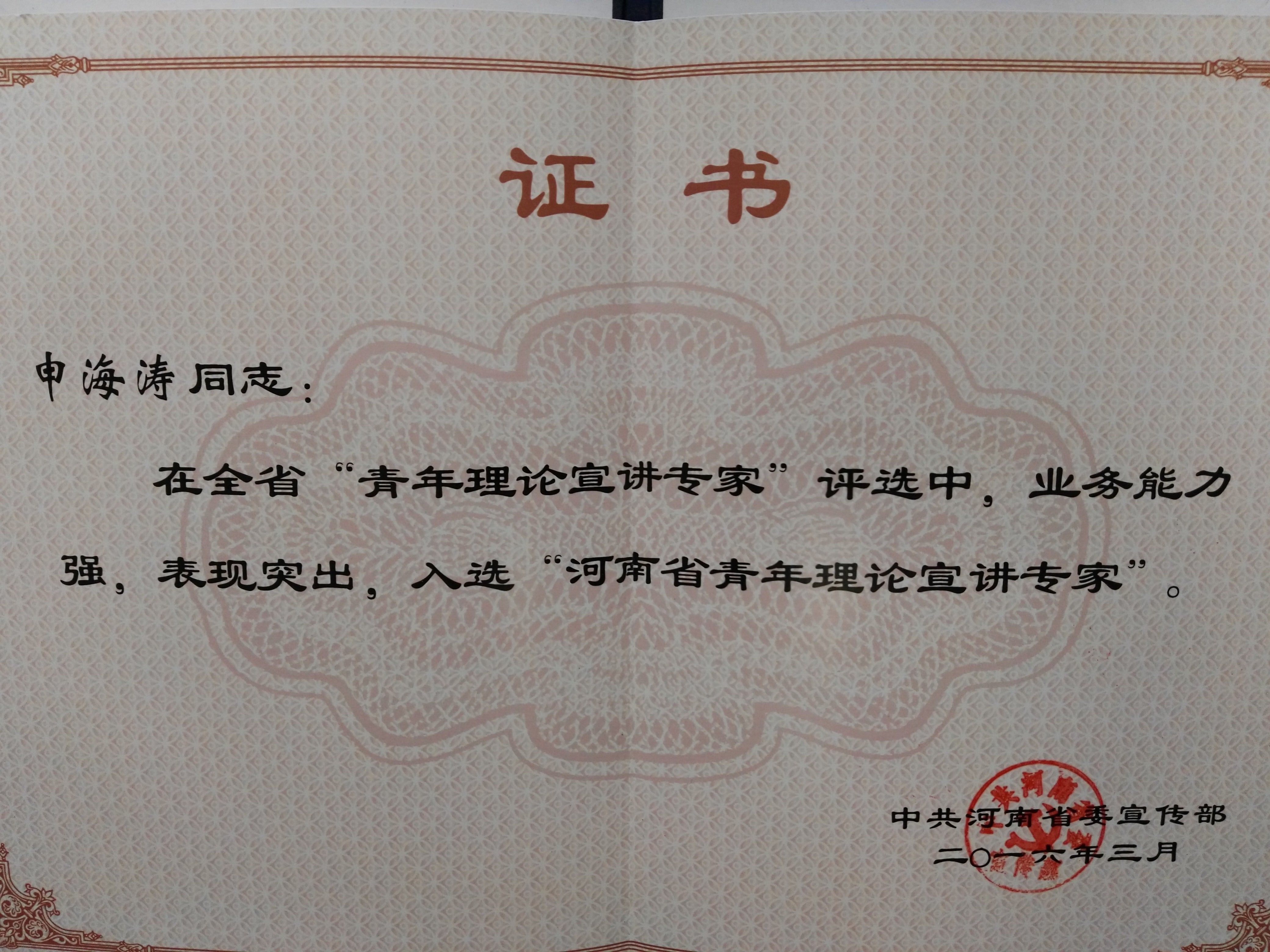 为进一步提升理论宣讲水平,壮大理论宣讲力量,打造一支高素质的理论宣讲人才队伍,2015年9月至2016年2月,河南省委宣传部组织实施了“关于遴选青年理论宣讲专家”的评选活动。经过推荐申报、专家评选、网上展播等环节,最终确定了30名政治素质硬、业务水平高、表达能力强、发展潜力大的青年理论宣讲专家。申海涛同志凭借其突出表现,顺利入选。同时,省委宣传部在红旗渠干部学院举办全省青年理论宣讲专家培训班,省委宣传部副部长李宏伟出席开班仪式,并为青年理论宣讲专家颁发了荣誉证书。申海涛在培训班上作了《台湾问题及其未来走向》的示范宣讲,得到与会领导和专家的一致好评。申海涛将作为宣讲团成员,在省委宣传部的统一安排下,赴各省辖市、省直管县(市)、高等院校及“大豫讲坛”等理论宣讲基地开展宣讲活动。