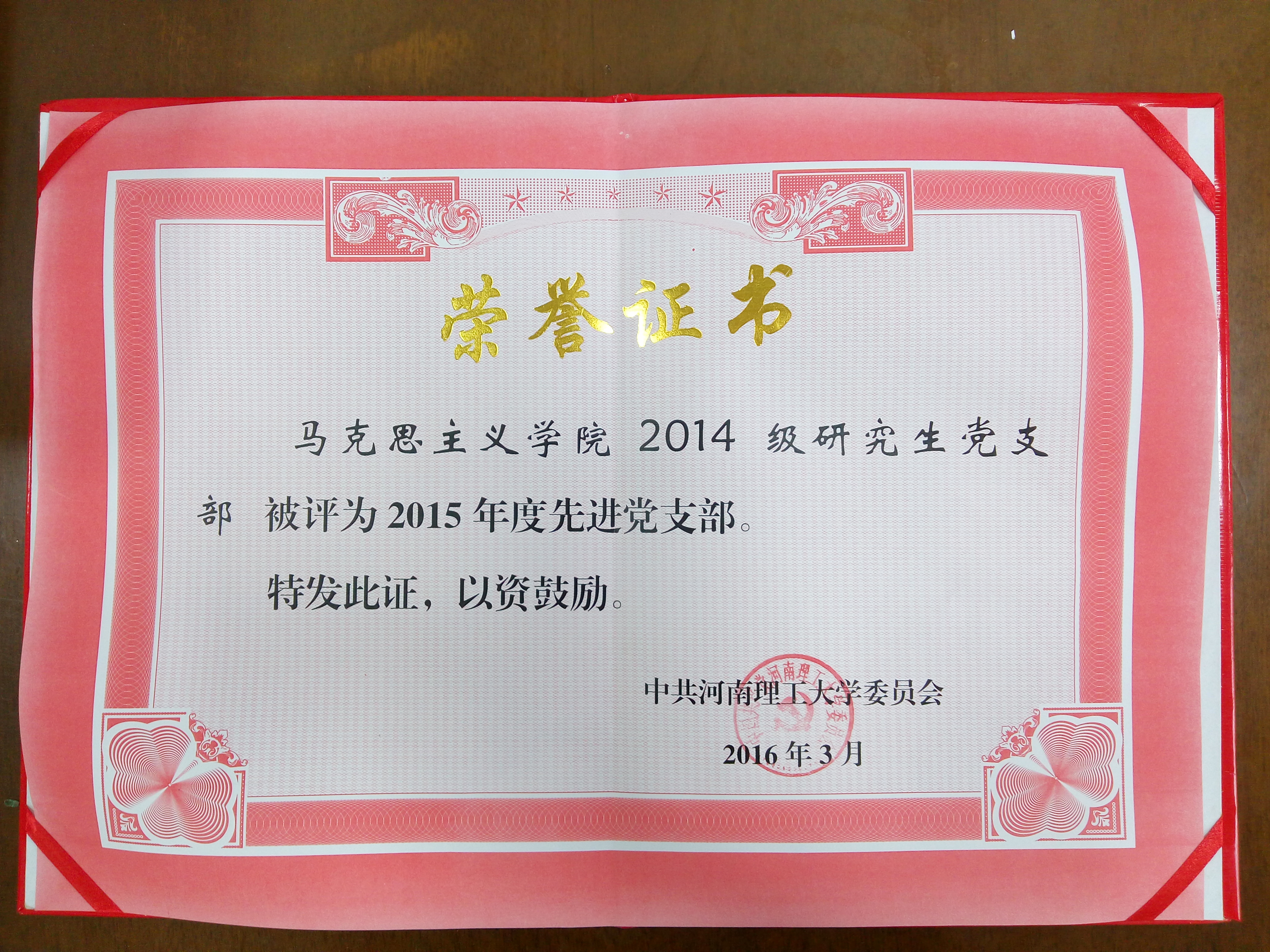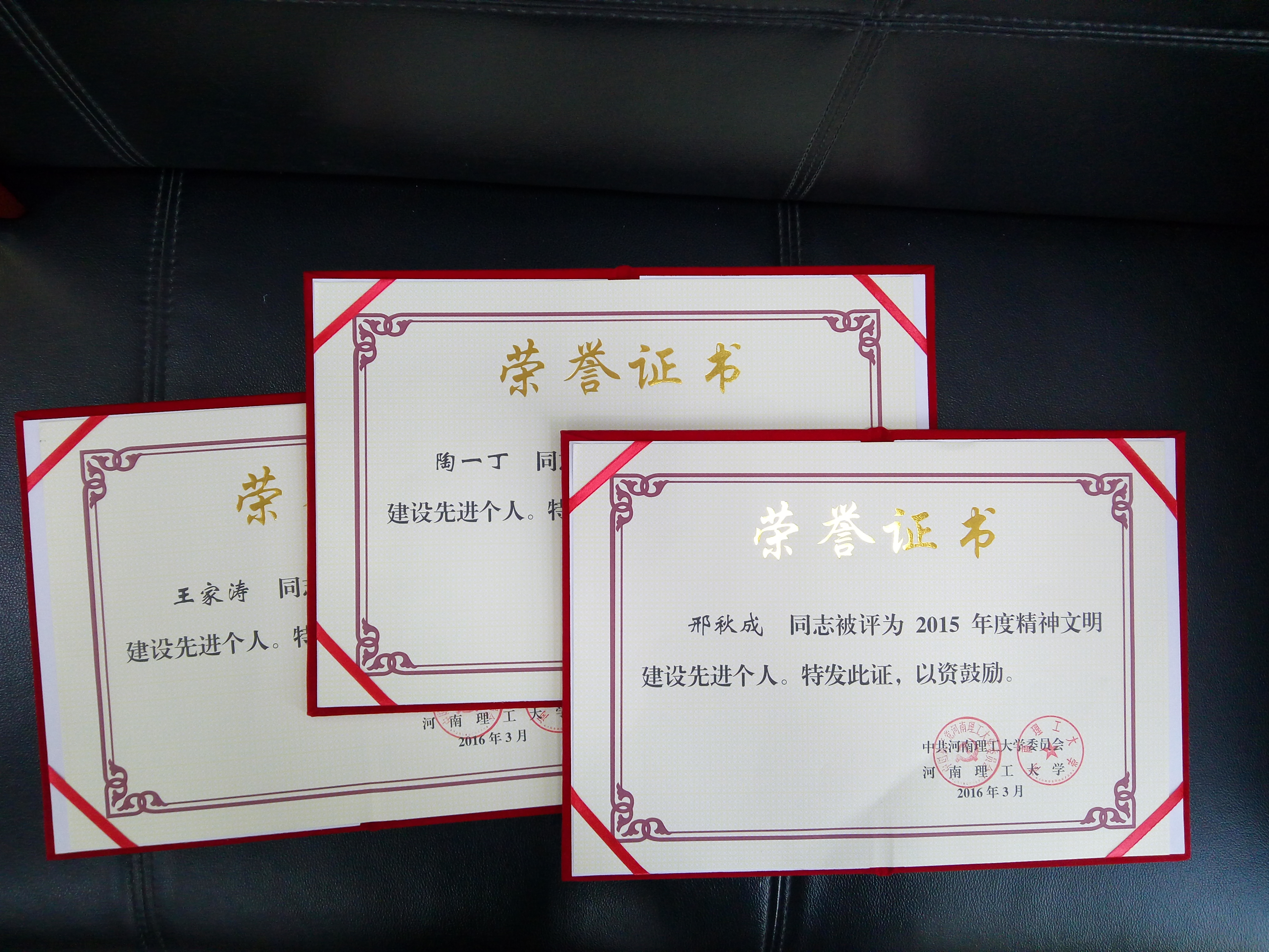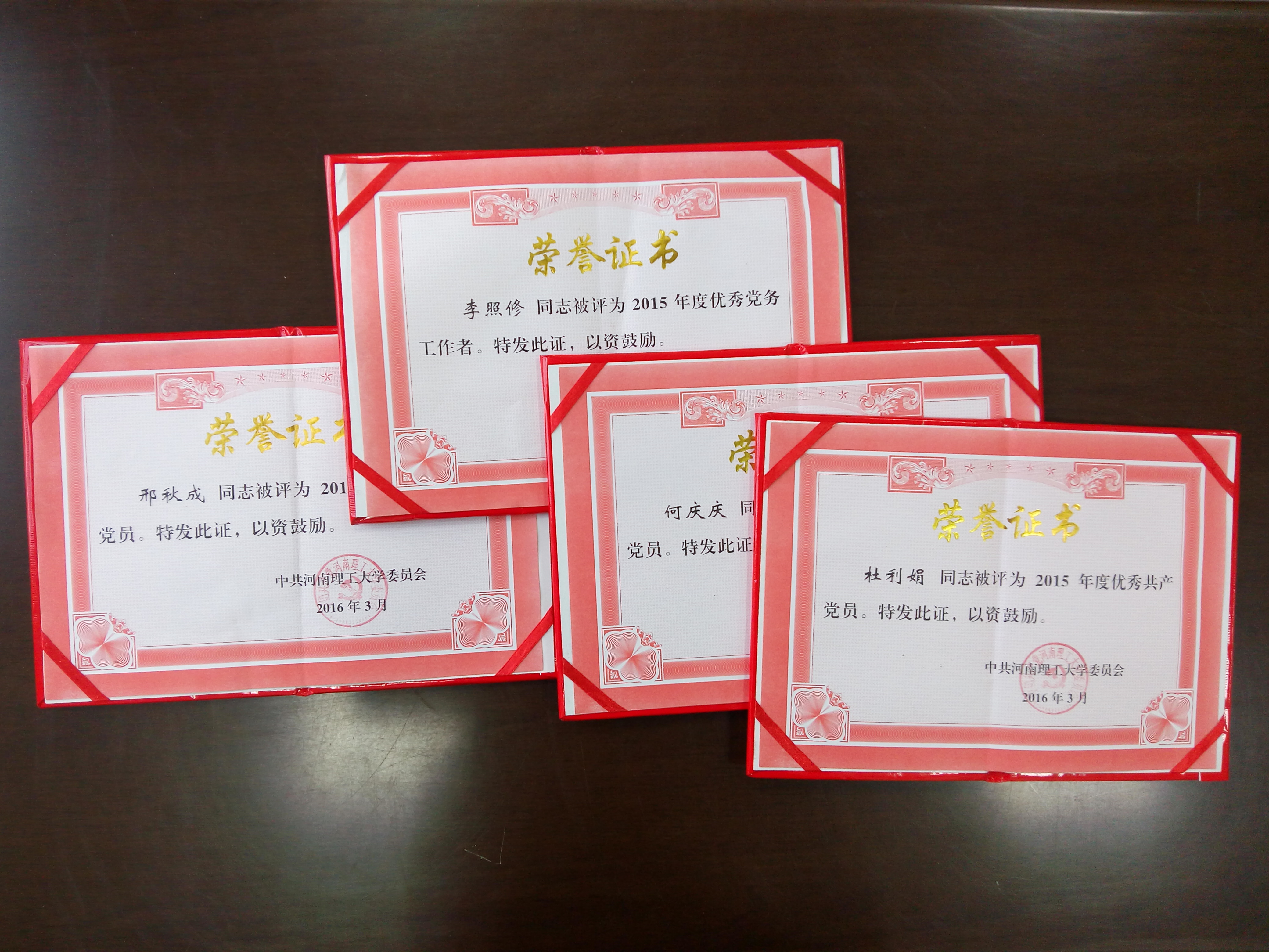 4月29日(周五)下午,学校在一号楼综合楼圆形报告厅召开2016年党建工作会议,我院党建工作在校先进单位评比中,成绩喜人,获得多个奖项。学院被评为校“2015年度先进党委”、“2015年度精神文明建设先进单位”、“2015年度五好关工委”;学院2014级研究生支部被评为“2015年度先进党支部”。同时,学院李照修书记被评为“2015年度优秀党务工作者”,邢秋成、杜利娟、何庆庆等同志获“2015年度优秀党员”的荣誉称号,邢秋成、陶一丁、王家涛等同志还获得了“2015年度精神文明建设先进个人”的荣誉称号。
