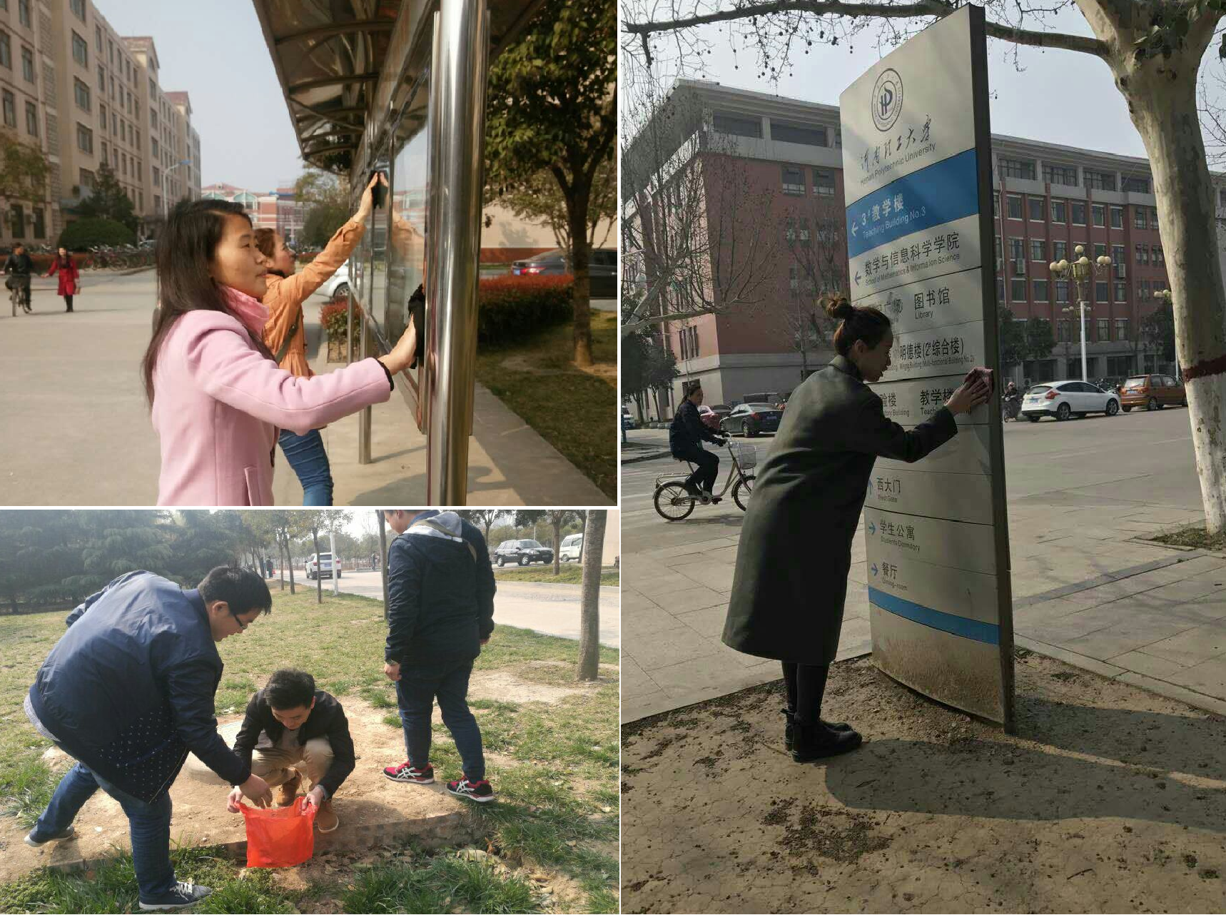 2016级研究生党支部书记王佳琪统一分配任务,支部党员和积极分子通力配合积极参与,对春秋大道左右两侧草坪及附近道路进行分工清理。同学们认真清理垃圾,不怕脏,不喊累,相互配合。经过一番努力,林间小道、草坪深处已不见塑料袋,瓜皮纸屑的踪影。路旁的指路牌也被擦拭的一尘不染,小广告被清理的干干净净,路过的广大师生纷纷点赞。