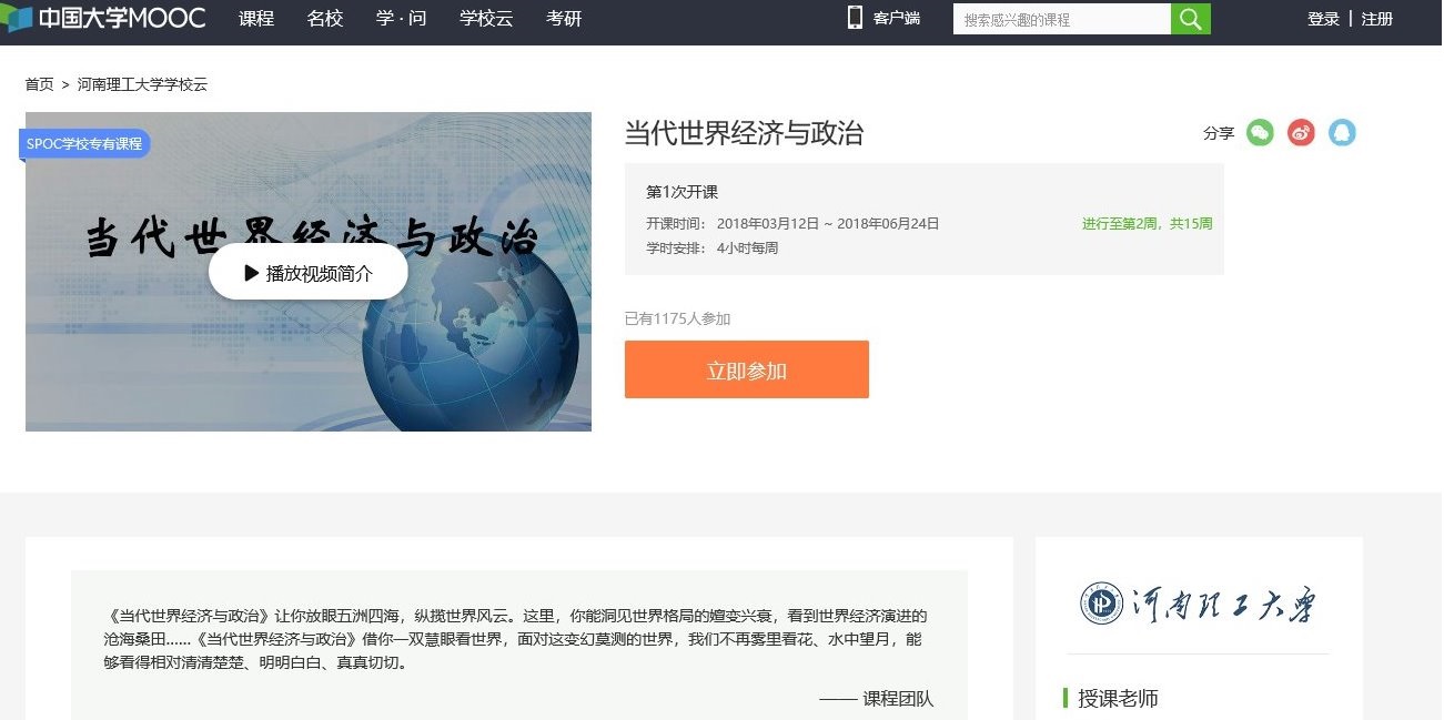 为了深入贯彻《教育部办公厅关于建设学习贯彻党的十九大精神“万个示范课堂”的通知》和《关于建设学习贯彻党的十九大精神高校思想政治理论课教师“名师示范课堂”的通知》的文件精神,在学校党委的领导下,在宣传部、教务处的直接指导下以及现代教育中心的配合下,我校思想政治理论课《当代世界经济与政治》本学期在中国大学MOOC平台河南理工大学专属SPOC上线,对探索以新媒体新手段学习宣传习近平新时代中国特色社会主义思想,促进思想政治理论课教学方式的变革具有重要意义。