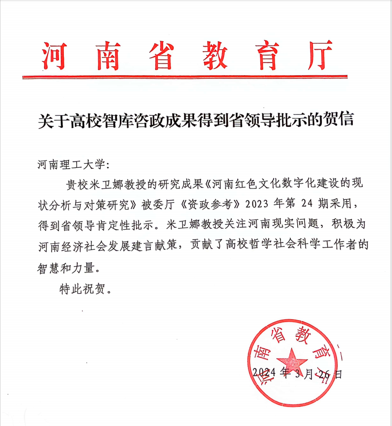 近日,马克思主义学院米卫娜副教授、申海涛副教授的研究成果《河南红色文化数字化建设的现状分析与对策研究》(刊发在《资政参考》2023年第24期),获得河南省人民政府副省长张敏的肯定性批示,被批转至省政府相关部门认真阅研,并收到省教育厅的贺信。