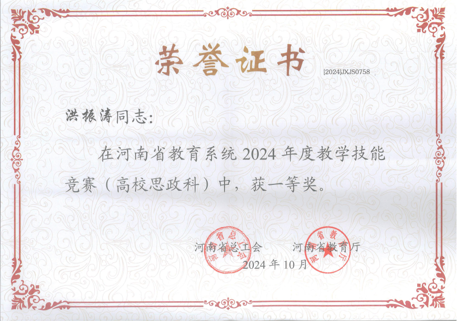 10月21日,河南省总工会、河南省教育厅发文通报河南省教育系统2024年度教学技能竞赛获奖情况,我院洪振涛、余敬两位教师分别获得高校思政科一等奖、二等奖。