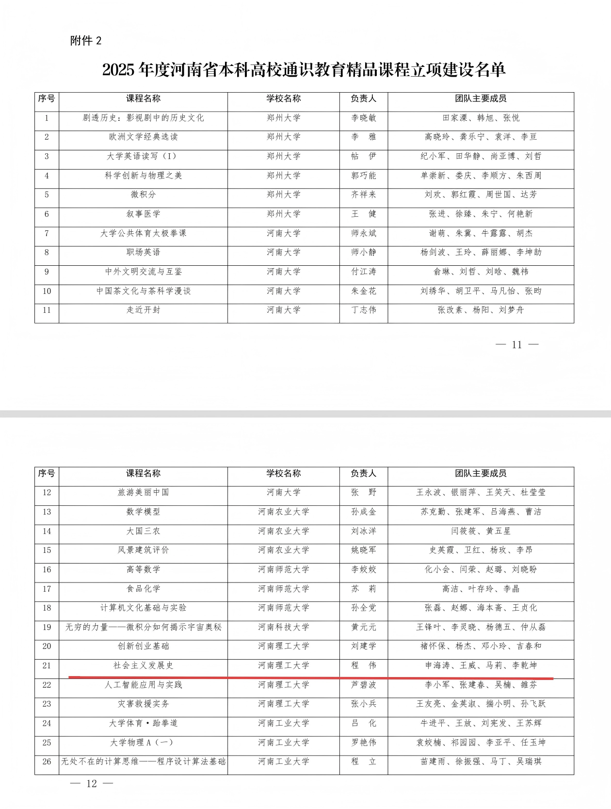 11月17日,河南省教育厅公布2025年度河南省本科高校精品课程立项建设名单,马克思主义学院由程伟教授主持,申海涛副教授、王威副教授、马莉副教授、李乾坤副教授作为团队成员共同申报《社会主义发展史》课程,经过多轮严格评审,成功入选河南省本科高校通识教育精品课程立项建设名单。