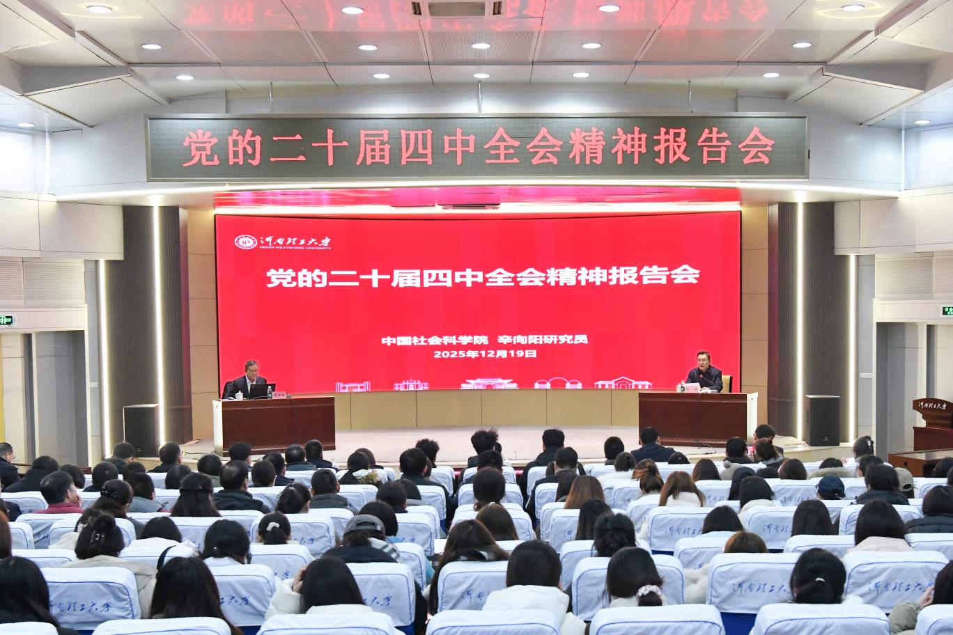 12月19日,学校在力行楼学术报告厅举行学习贯彻党的二十届四中全会精神宣讲报告会,中国社会科学院辛向阳研究员以《人民至上与“十五五”规划》为题作专题报告。校党委书记刘永涛出席报告会,并为辛向阳研究员颁发马克思主义学院首席专家聘书。报告会由校党委副书记程伟主持,校党委中心组成员、党群部门负责人、二级党组织书记及副书记、校宣讲团专家、专兼职思政课教师及马克思主义学院研究生代表参会。