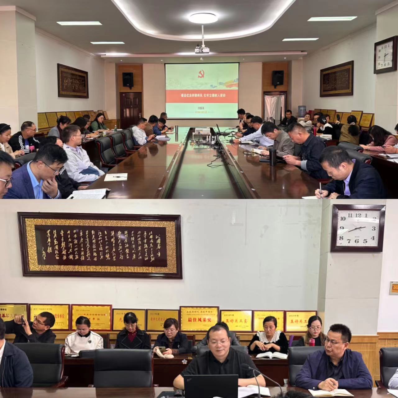 洪振涛以党的十八大以来习近平总书记关于师德师风建设的重要论述为切入点,系统梳理了教育、教师和师德师风的内涵及其联系,层层递进阐发了“百年大计、教育为本”“教育大计、教师为本”“立师之道、师德为先”的内在逻辑。结合教育部自2019年以来公开曝光的13批违反教师职业行为十项准则典型案例,从中选择“立场不稳、政治违纪”“学术不端、急功近利”“行为不检、道德败坏”“从教不廉、谋取私利”等4个方面的12起高校典型案例,以案正纪,剖析根源,为全体教师敲响了修身律己、崇德向善的警钟。围绕习近平总书记提出的“四有”好老师标准,从“坚定理想信念,补足精神之钙”“培育道德情操,引来源头活水”“练就扎实学识,筑牢楼台之基”“涵养仁爱之心,立稳人格支柱”等四个方面,指明了锻造优良师德师风、扛牢立德树人使命的努力方向。最后,洪振涛带领全体教职工重温了《新时代高校教师职业行为十项准则》,勉励老师们全面理解和准确把握十项准则,将其刻在心底、摆在首位、内化于行,争做以德立身、以德立学、以德施教、以德育德的楷模,为学生健康成长成才和学校“双一流”创建作出应有的贡献。