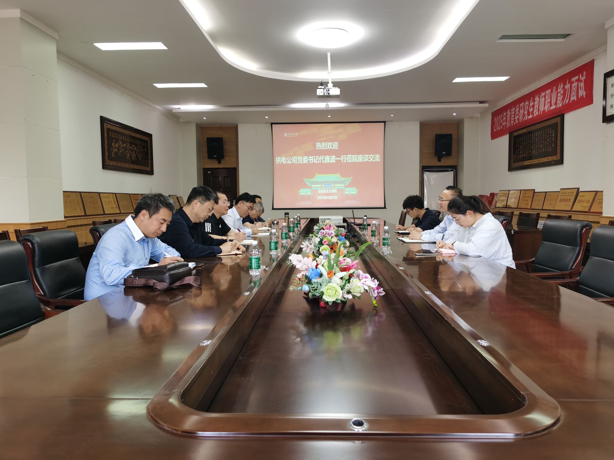 4月25日下午,国家电网焦作供电公司党委书记代鑫波带领党建部副主任王洪涛、秘书王晓佳莅临马克思主义学院,围绕国有企业党建工作开展调研。学院在文科楼222会议室召开座谈会,院领导洪振涛、郑小九、陈留根及教师代表参会,座谈会由院长郑小九主持。