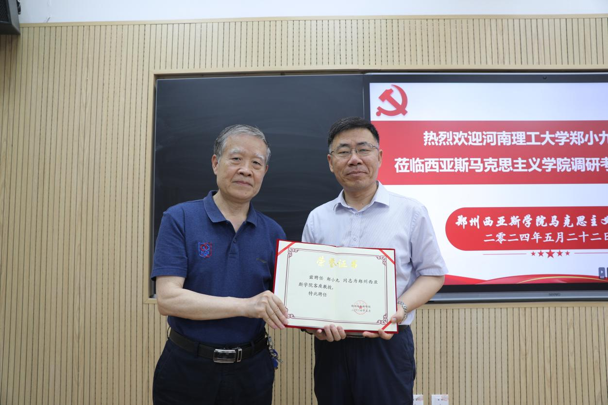 郑州西亚斯学院副校长赵予新为郑小九院长颁发客座教授聘任证书