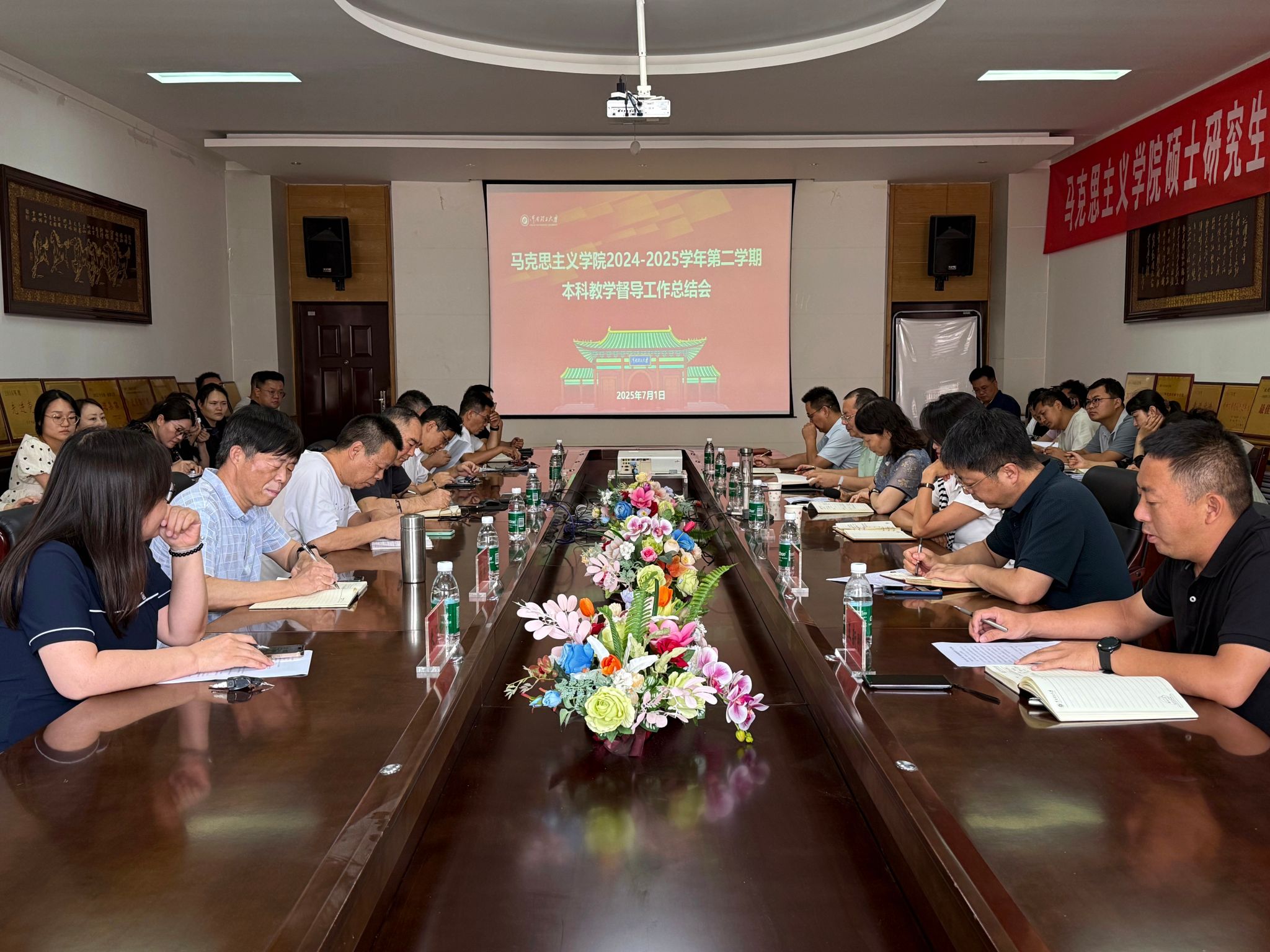 2025年7月1日下午,马克思主义学院在文科楼202会议室召开2024-2025学年第二学期本科教学督导工作总结会,系统梳理本学期教学督导工作成效,部署下一阶段教学改革重点任务。校级督导专家梁丽娟教授、郭慧娟老师应邀出席会议,学院领导班子、督导组成员、各教研室主任及全体教师参会。会议由学院党委书记洪振涛主持。