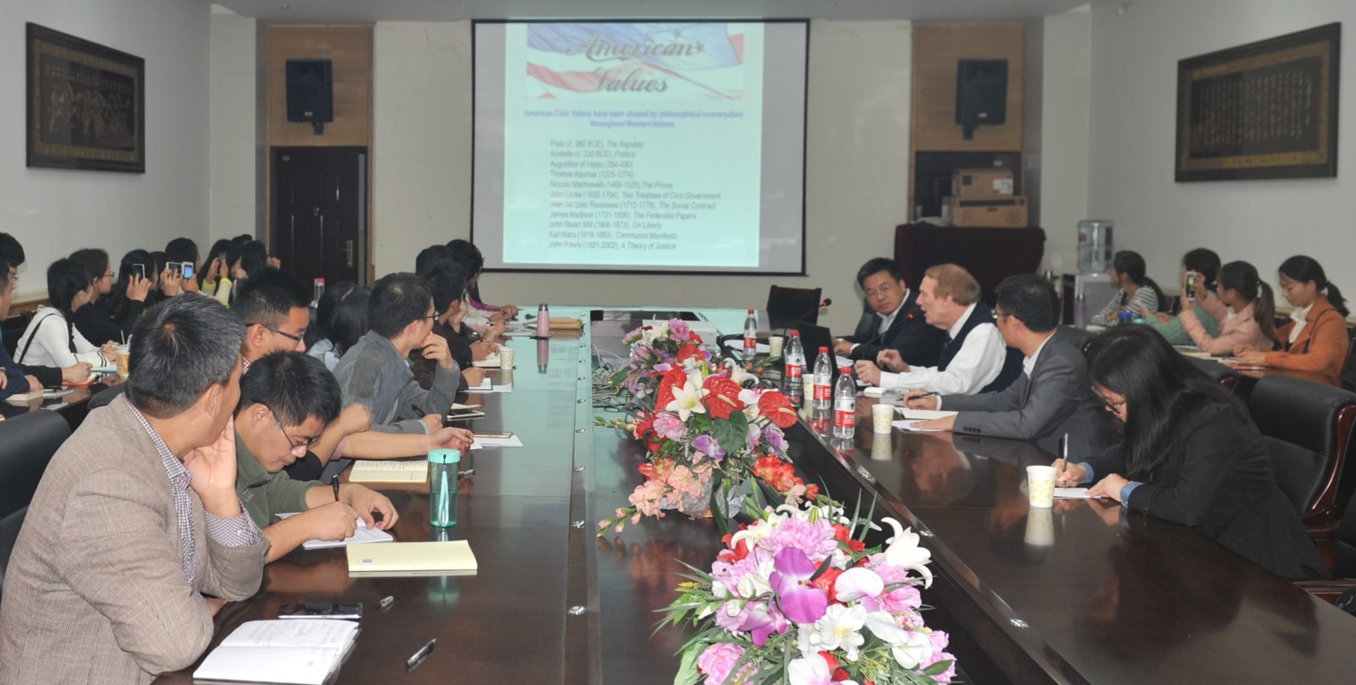 10月21日上午,应我院邀请,美国贝尔蒙特大学亚洲研究中心主任罗尼•小约翰作了题为《构建和谐社会过程中培育公民价值观的必要性——基于中国和美国的比较》的学术报告。报告在文科综合楼202会议室举行,学院部分教师和全体研究生参加。讲座由学院副院长郑小九主持,副教授李海玉担任翻译。
