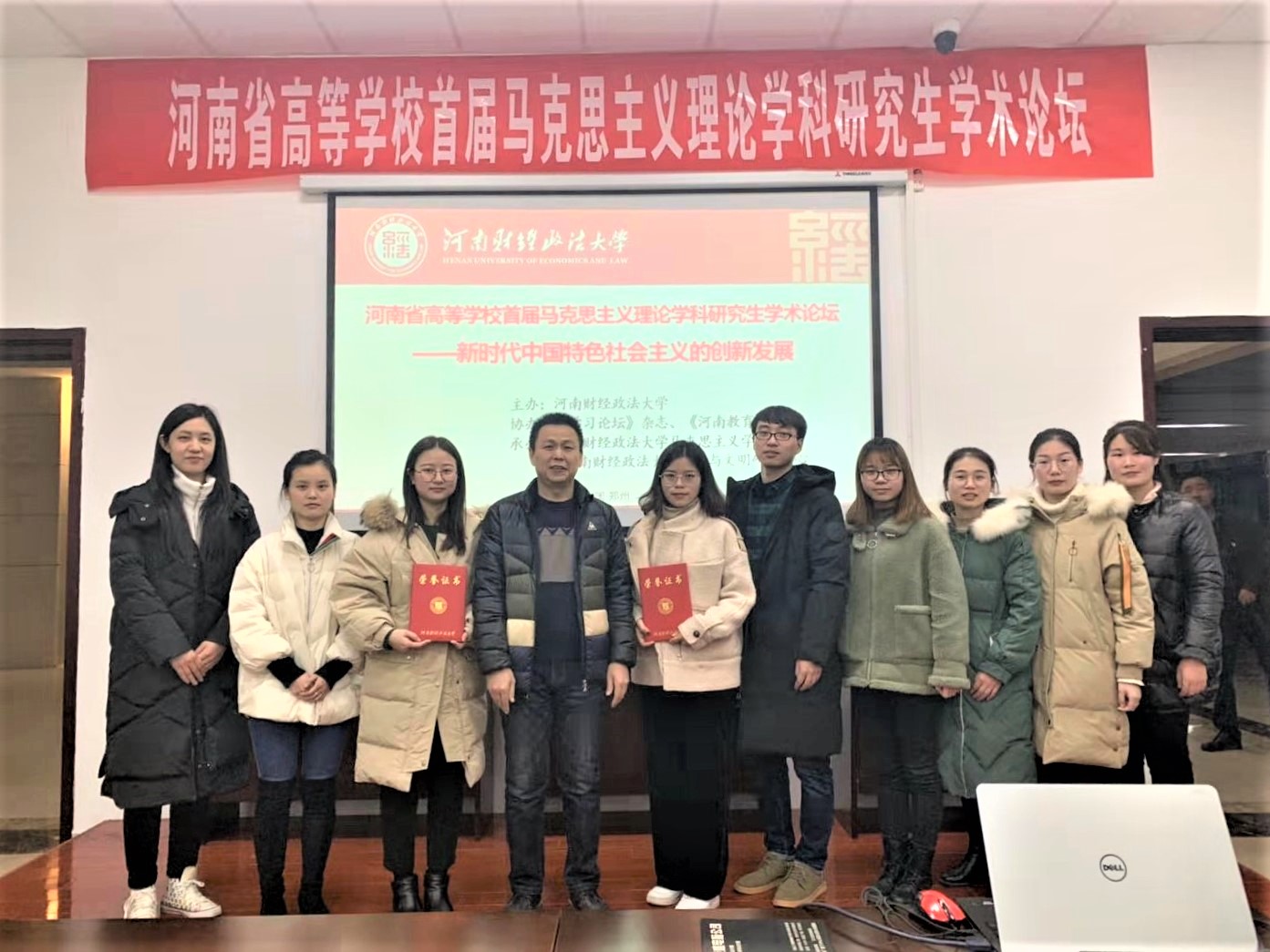 “河南省高等学校首届马克思主义理论学科研究生学术论坛”由河南财经政法大学主办、河南财经政法大学马克思主义学院和道德与文明研究中心承办、《学习论坛》杂志和《河南教育》杂志协办。自论坛通知发出以来,我院领导高度重视,学院研究生积极投稿、踊跃参与,共计投稿10篇,得到了与会专家的充分肯定,其中,我院2018级硕士研究生姜敏的论文《中国共产党初心和使命的哲学思考》获得优秀论文特等奖、2018级硕士研究生冯肖贞的论文《试析新时代人民立场的基本内容与当代价值》获得优秀论文一等奖的佳绩。