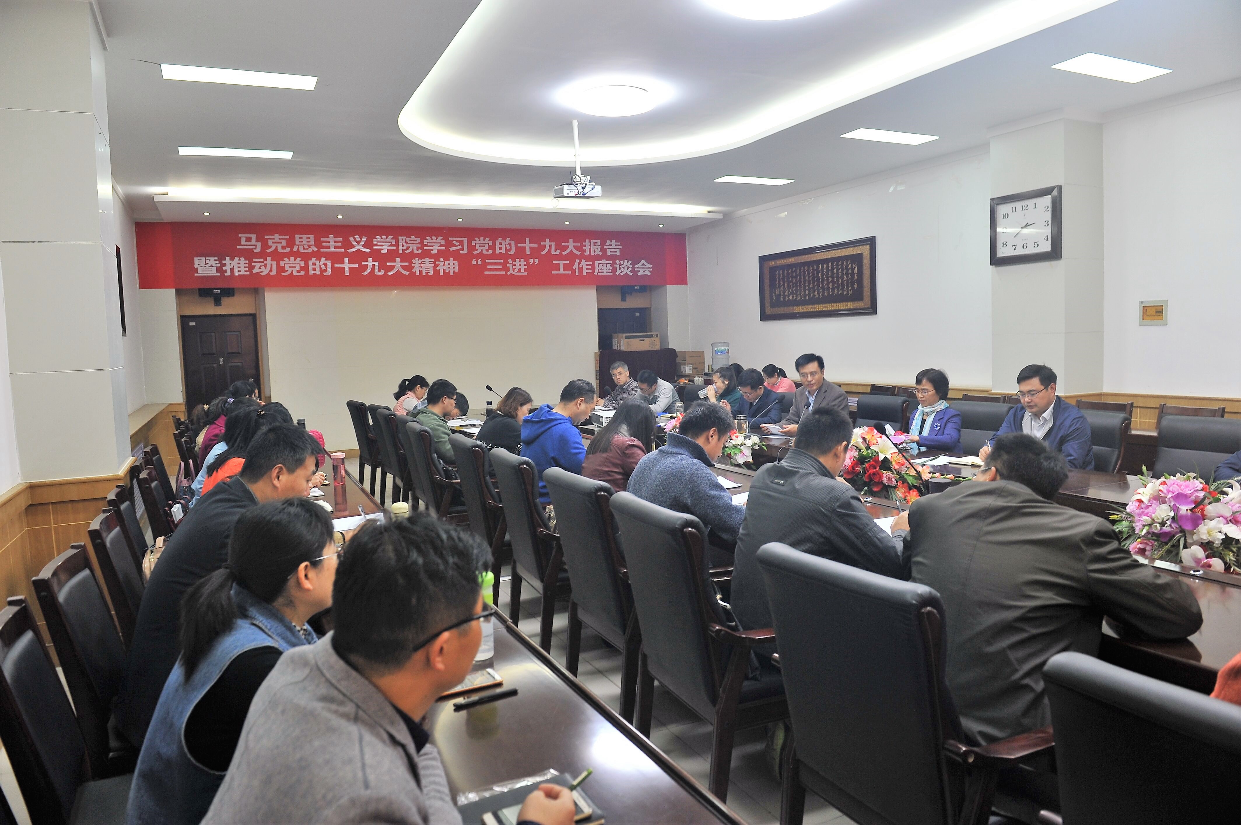 为进一步深入学习领会党的十九大精神,更好更快地让十九大精神“进教材、进课堂、进头脑”,充分发挥好高校思想政治理论课宣传学习十九大精神的主渠道、主阵地作用,10月24日下午,学院在文科楼202会议室组织全院教职工召开了“学习党的十九大报告暨推动党的十九大精神‘三进’工作座谈会”,座谈会由该院党委书记李照修主持。 座谈会准备充分,大家都在会前准备了发言提纲,有23位教师作了重点发言。大家普遍认为习近平总书记的报告令人鼓舞,振奋人心,并结合自身学习十九大报告的感悟和体会,从十九大报告中展现出来的新思想、新时代、新矛盾、新目标和新方略等方面进行了认真交流。 院长侯菊英首先发言,她认为习近平总书记的报告博大精深、高屋建瓴、目标明确、路径清晰、举措有力,既接老百姓的民生地气,又展中国崛起的磅礴大气,更显中国共产党执政的决心勇气。副院长郑小九说,学习十九大报告,感受最深的就是一个“新”字:新的历史起点、新时代中国特色社会主义思想的指导、新发展理念、新征程、新蓝图;副院长张富文初步设想了十九大精神“三进”的教学课时安排;邵发军副教授在发言中详细阐述了十九大报告中的“人类命运共同体”命题;李伟博士高度评价了习近平总书记的战略思维;陈留根副教授与大家交流了关于社会主义初级阶段主要矛盾的认识;李海玉副教授则从认识新时代的角度,对新时代划分的依据、性质、特征以及新时代中国特色社会主义思想与邓小平理论的关系等谈了看法。座谈会气氛热烈祥和,精彩的发言不时引来阵阵掌声。座谈会上,大家还研讨了宣讲十九大精神的重点和方式,以及在研究生的专业课和全校思想政治理论课“进教材、进课堂、进头脑”的具体路径。 座谈会最后,李照修指出,马克思主义学院是意识形态工作的前沿阵地,肩负着传承发展马克思主义、培育社会主义建设者和可靠接班人、引领社会思潮走向的重要使命,希望大家准确把握十九大报告的新思想、新论断,做好集体备课,持续推进思想政治理论课教育教学改革,帮助广大学生增强对中国特色社会主义历史方位的认知,进一步增强社会责任感和历史使命感。并要求老师们在本学期所有思政课中适时讲授学习十九大精神专题,宣讲团成员认真备课,做好宣讲准备。希望老师们以学习十九大报告为契机,扎扎实实地做好课题申报、理论研究工作,争取多出成果,为学校事业发展作出新的更大的贡献。 |