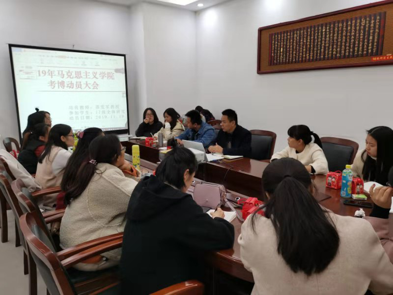 2019年11月19日,马克思主义学院研究生考博动员大会在文综楼223会议室召开。动员会由学院副院长邵发军主讲,2017级全体研究生出席了本次会议。