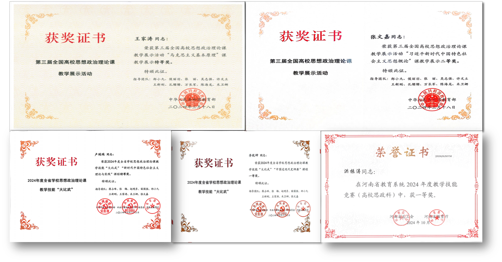 此外,在2024年度全省学校思想政治理论课教学技能“大比武”中,卢瑞瑞获特等奖,李乾坤获一等奖,赵娜娜、雷博雯获二等奖,杨晓军、闫璐璐、尚延波、吴桧榛获三等奖;在2024年度全省教育系统教师技能竞赛中,洪振涛、余敬分别获一等奖、二等奖;在河南省高校首届《中华民族共同体概论》课程教学展示活动中,杨平平获二等奖。