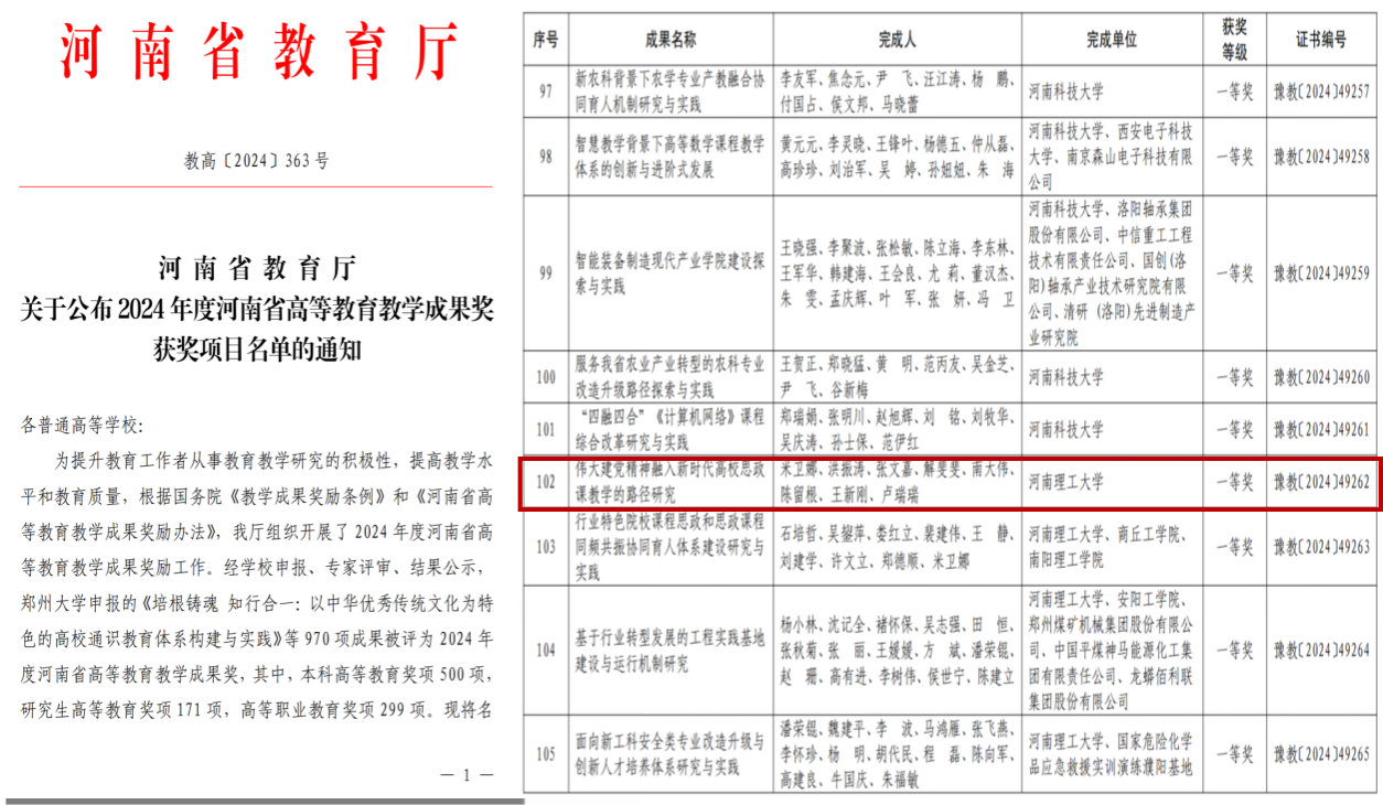 2024年11月21日,河南省教育厅公布2024年度河南省高等教育教学成果奖获奖项目名单,米卫娜主持的《伟大建党精神融入新时代高校思政课教学的路径研究》获2024年度河南省本科高等教育教学成果一等奖。