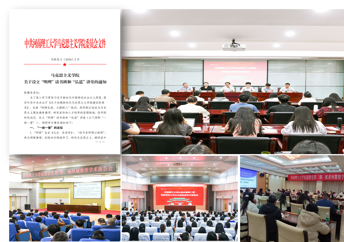 2024年,为弘扬“明理弘道,立德树人”院训,打造马克思主义理论教育教学、研究宣传和人才培养的坚强阵地,学院党委设立“明理”读书班和“弘道”讲堂。教育部长江学者特聘教授、国务院学科评议组专家杨凤城,教育部长江学者特聘教授、国务院学科评议组专家王永贵,中央马克思主义理论研究和建设工程专家、国务院学科评议组专家祝黄河先后做客弘道讲堂。“明理弘道大讲堂”获学校党建特色品牌建设立项。