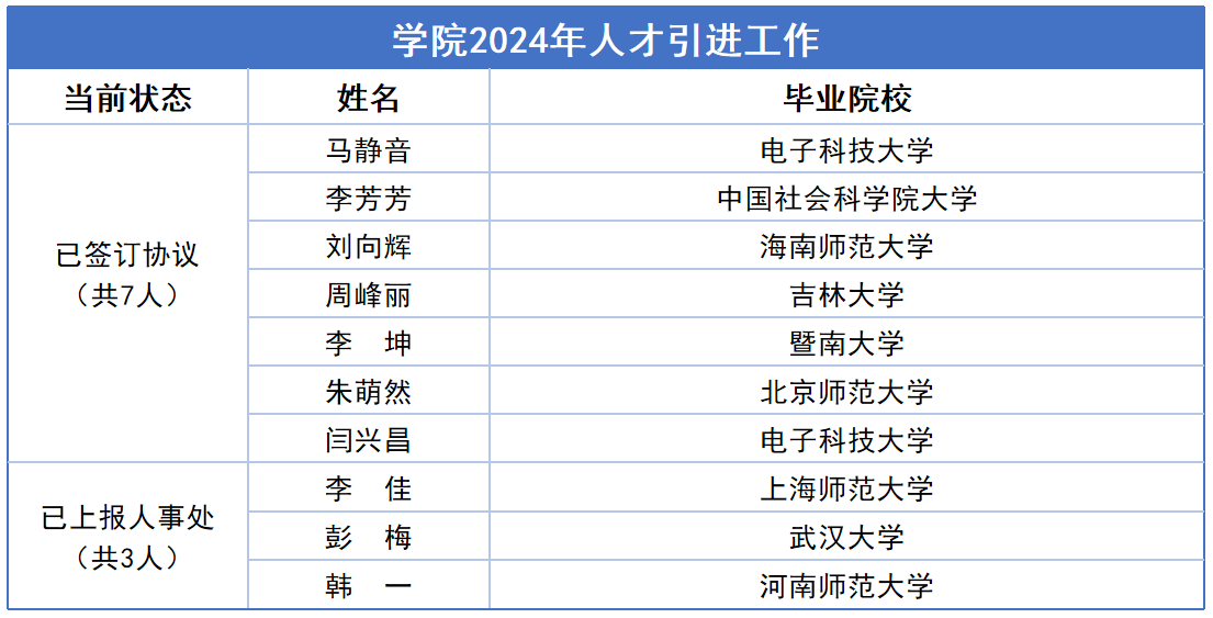2024年,电子科技大学博士马静音、中国社会科学院大学博士李芳芳、海南师范大学博士刘向辉、北京师范大学博士朱萌然、暨南大学博士李坤、电子科技大学博士闫兴昌、吉林大学博士周峰丽先后与学校签订就业协议。另有上海师范大学博士李佳、武汉大学博士彭梅、河南师范大学博士韩一已通过学院面试考察,待学校审核签约。一批青年博士的加盟入职,为学院事业发展注入了新鲜血液,昭示着学院发展的美好未来。