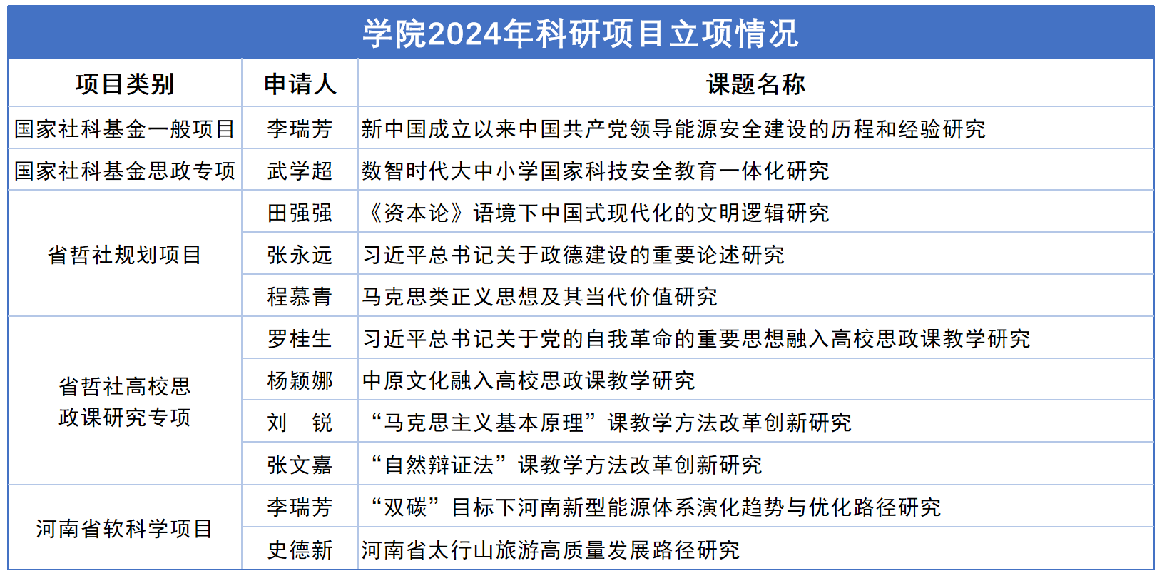 2024年,李瑞芳申报的《新中国成立以来中国共产党领导能源安全建设的历程和经验研究》获国家社科基金一般项目立项,武学超申报的《数智时代大中小学国家科技安全教育一体化研究》获国家社科基金高校思想政治理论课研究专项立项。
