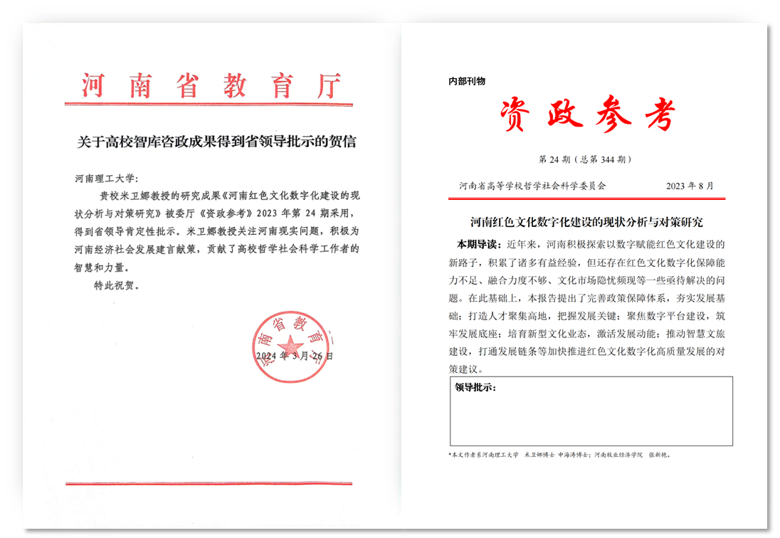 2024年3月26日,河南省教育厅向我校发来《关于高校智库咨政成果得到省领导批示的贺信》,指出:“贵校米卫娜教授的研究成果《河南红色文化数字化建设的现状分析与对策研究》被委厅《资政参考》2023年第24期采用,得到省领导肯定性批示。米卫娜教授关注河南现实问题,积极为河南经济社会发展建言献策,贡献了高校哲学社会科学工作者的智慧和力量。特此祝贺。”
