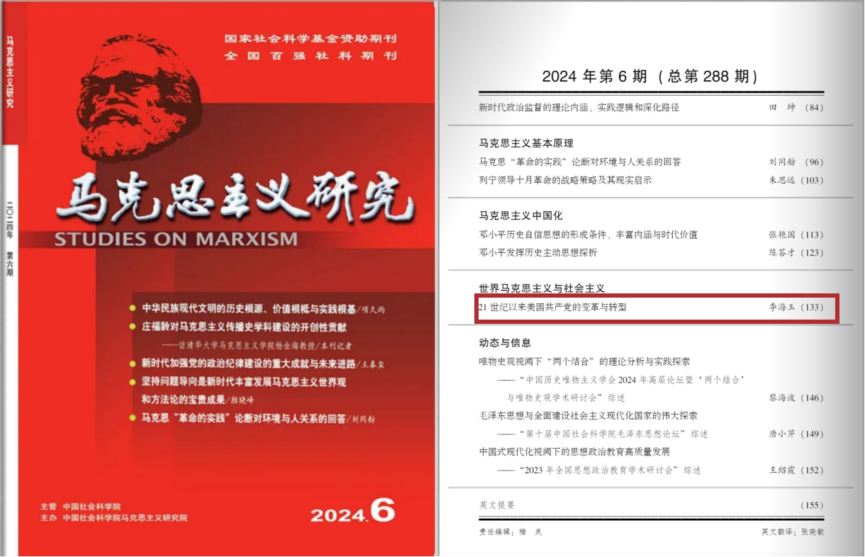 2024年6月,李海玉教授的学术论文《21世纪美国共产党的变革与转型》在CSSCI权威核心期刊A刊《马克思主义研究》2024年第6期发表,为近年来学院教师在《马克思主义研究》发表的第3篇学术论文。