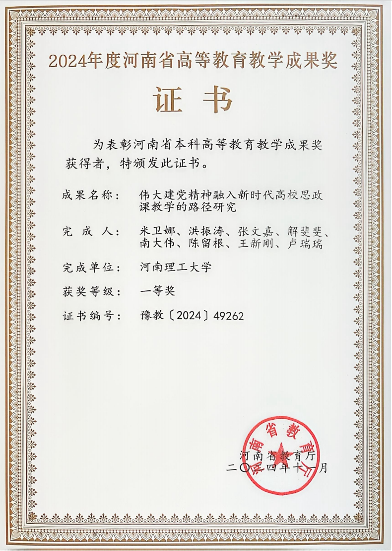 2024年11月,河南省教育厅下发了《关于公布2024年度河南省高等教育教学成果奖获奖项目名单的通知》(教高〔2024〕363号),我院米卫娜老师主持的《伟大建党精神融入新时代高校思政课教学的路径研究》荣获省高等教育教学成果奖一等奖。