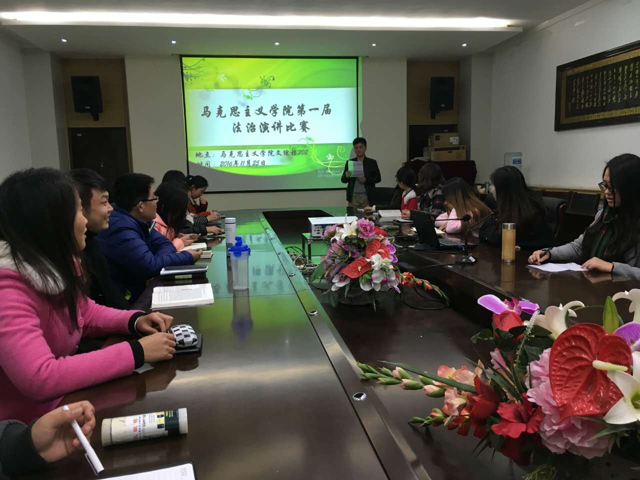 为落实国家“七五”普法规划工作,推动我国社会主义法治建设,增强研究生法治观念,提高研究生法律意识。马克思主义学院于11月25日在文综楼202室举行“马克思主义学院第一届法治演讲比赛”。此活动由马克思主义学院主办,校中国特色社会主义理论研究会、马克思主义学院研究生会承办。