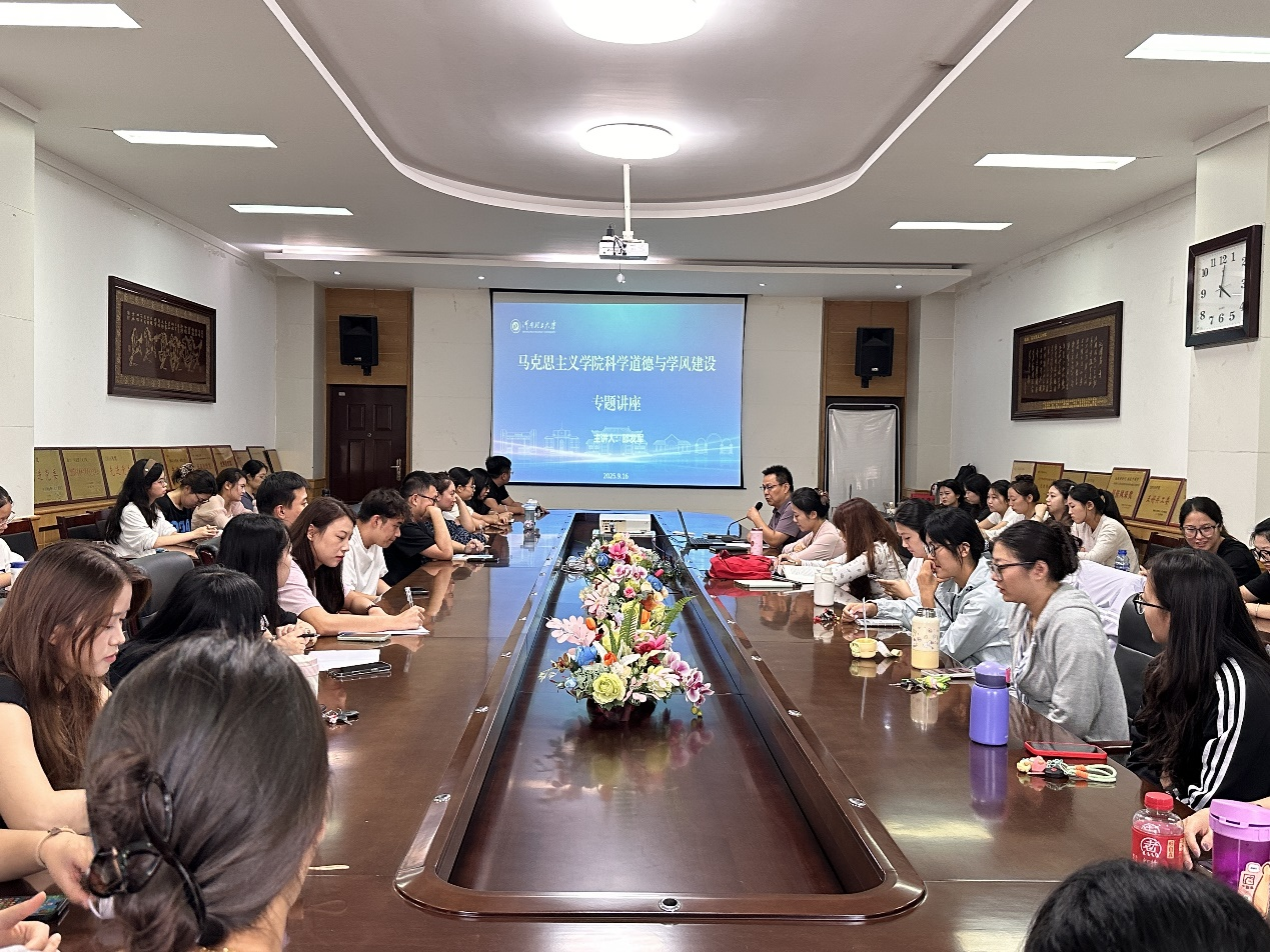为落实立德树人根本任务,强化新生的科研诚信意识,推动学院研究生科学道德和学风建设,9月16日下午,马克思主义学院在文综楼202会议室举行“科学道德与学风建设”专题讲座。本次讲座由马克思主义学院副院长邵发军主持,2025级全体研究生新生参加。